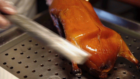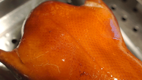 选用北方枣木挂炉式明火烤制,这样烤出来的鸭鸭果香味浓郁,在烤炉待足70分钟之后,皮下的油全给逼出来了!